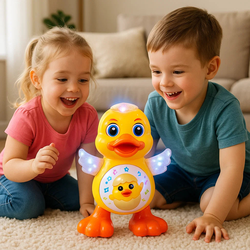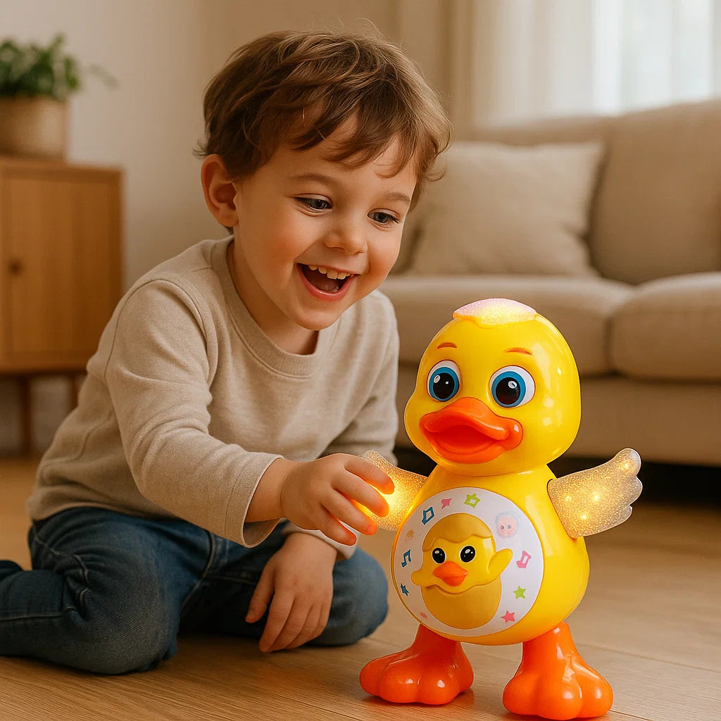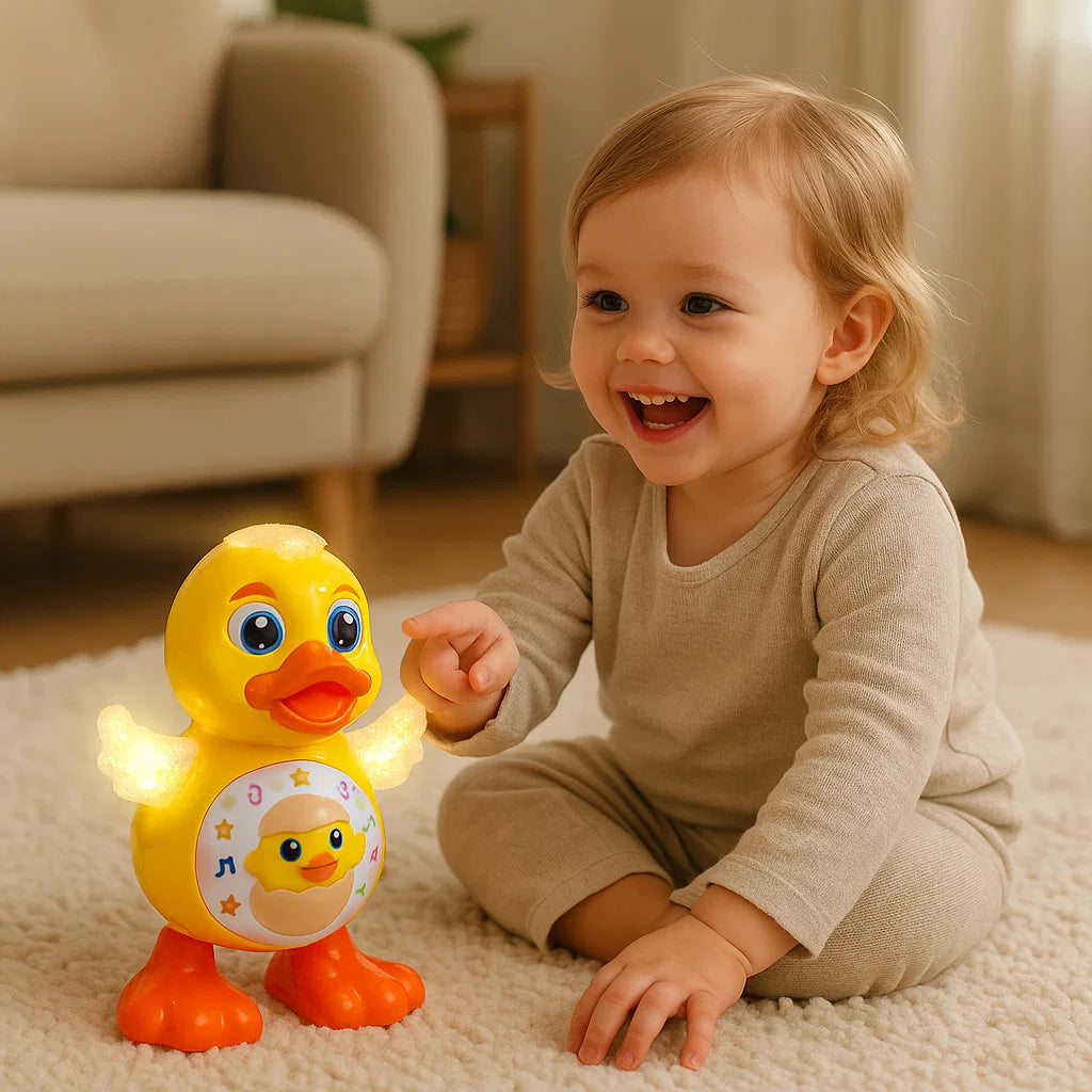 Den dansande ankan för barn lyser upp varje dag med glad musik, färgglada ljus och roliga rörelser. Den stöder den motoriska utvecklingen, stimulerar fantasin och uppmuntrar till gemensam lek, skratt och dans.
