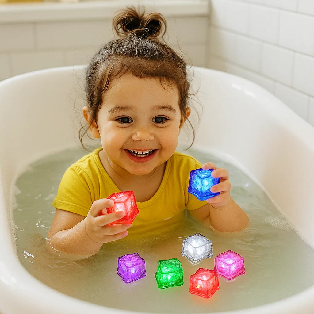 Förvandla badrummet till ett färgsprakande hav av ljus! De lysande badkuberna gör varje bad till en fascinerande upplevelse full av färg, lek och förundran. Så snart de kommer i kontakt med vatten börjar de lysa – perfekt för att göra badstunden till ett riktigt äventyr.